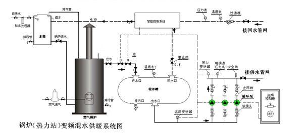 该设备取消了板式热交换器、一级循环水泵、一级循环水泵电气控制柜等设备。主要由变频恒压循环泵组、混水调温罐、回水减压和回水快速关断等主要部分组成,它直接采用锅炉一级管网热水(高温)与二次网回水(低温)用混水罐进行混水调温,恒温水经循环泵输出给二次采暖管网,二次采暖管网回水一部分进入混水罐进行循环调温,另一部分经减压后送至锅炉再次加温,从而实现了供暖系统不经过换热器进行节能供暖的目的。