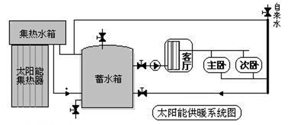 它主要由太阳能集热器、蓄水箱、水电一体加热系统组成,它充分利用自然界中的太阳能加热循环水(高温)在蓄水箱中与用户回水(低温)进行混水调温,恒温水经循环泵输送到水电一体加热系统后进入采暖用户,在采暖场所放热后,回水温度降低再次进入混水调温罐进行循环调温,从而实现清洁供暖。