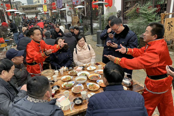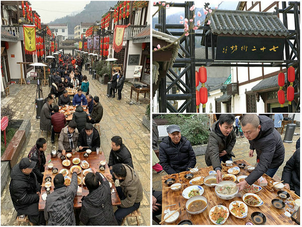 快报网讯:喝酒、吃肉、猜拳......2018年12月28日,安康石泉县后柳镇中坝小作坊的长街上,32桌庖汤宴开席,众多游客和当地人一起,提前享受着浓浓的年味。原来,这是2019年石泉庖汤会的预演。可谓“好戏在后头”:1月12日(腊月初七),石泉第七届汉水庖汤会将正式开吃,中坝小作坊3条长街将开百桌庖汤会盛宴。同时,还有丰富多彩的年俗活动持续上演,将让您体验到陕南别具特色的文化旅游大餐。