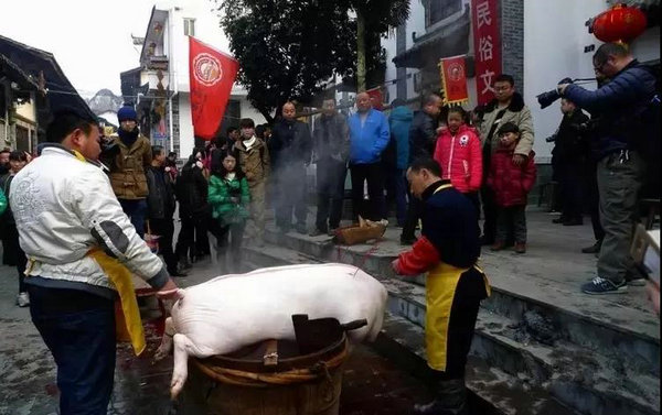 吃“庖汤”是流行在秦巴山区的一种传统习俗。在每年的腊月,村里家家户户都有杀猪过年的风俗,同时,乡户人家用新鲜的猪肉设“坝坝筵”款待亲朋好友和邻里乡亲,有庆丰年、谢邻里、祝合和、祈未来之意,俗称吃“庖汤”。