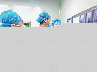 邢永军(右一)手术前阅片,与助手一起研讨手术方案