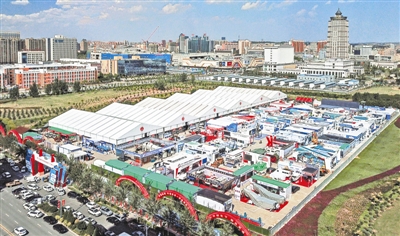 9月7日,第十五届榆林国际煤炭暨高端能源化工产业博览会布展就绪,静待揭幕(无人机照片)。