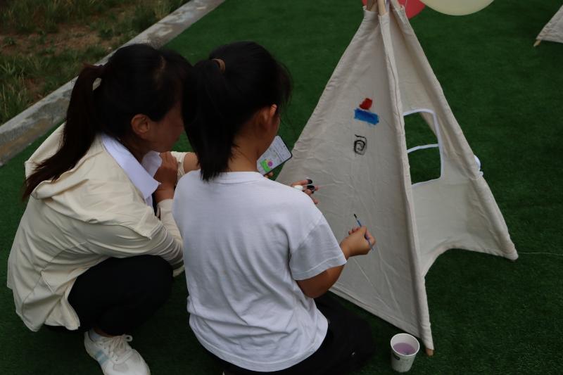 帐篷涂鸦环节,学员们分组创作,在志愿者协助下,用五彩画笔为帐篷增添绚丽色彩。成果展演中,学员们带来国学诵读《三字经》节选,韵味十足;健美操《快乐崇拜》《熊出没》活力四射,赢得阵阵掌声。