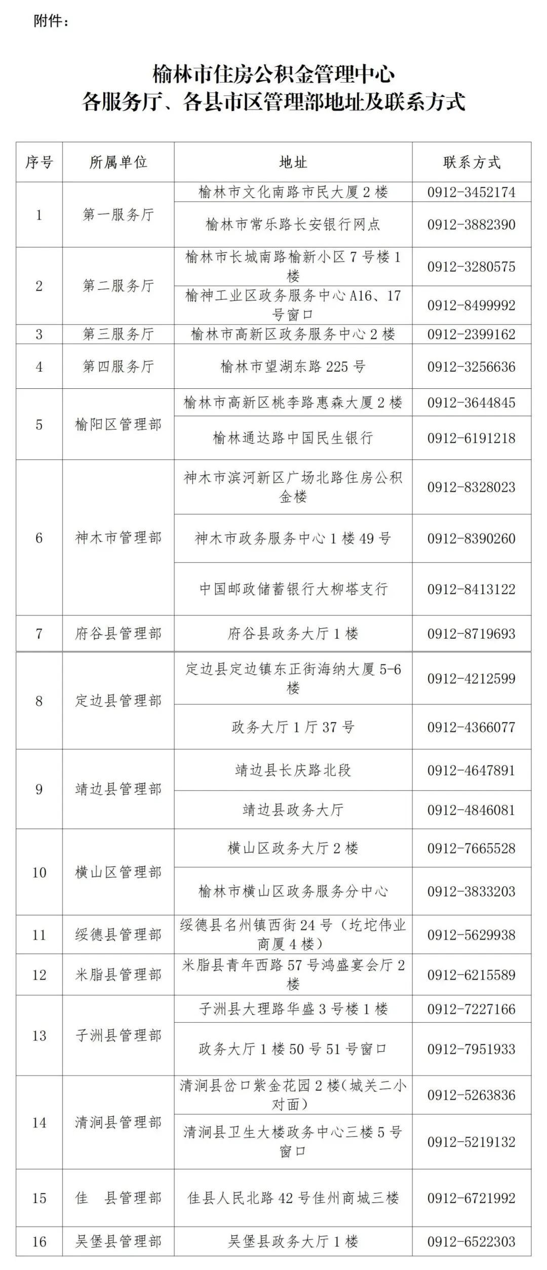 附件:榆林市住房公积金管理中心各服务厅、各县市区管理部地址及联系方式
