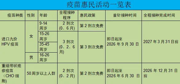 1.以上各年龄段人群进口九价HPV疫苗惠民活动首针接种时间延长至2026年9月30日前,全程接种时间延长至2027年3月31日前。