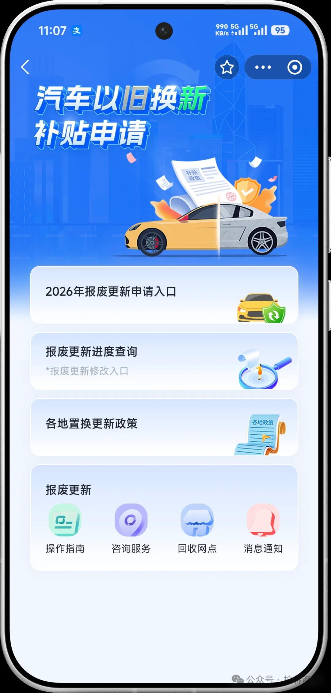 手机端:通过支付宝、抖音、微信、云闪付平台搜索“汽车以旧换新”小程序进入申请页面