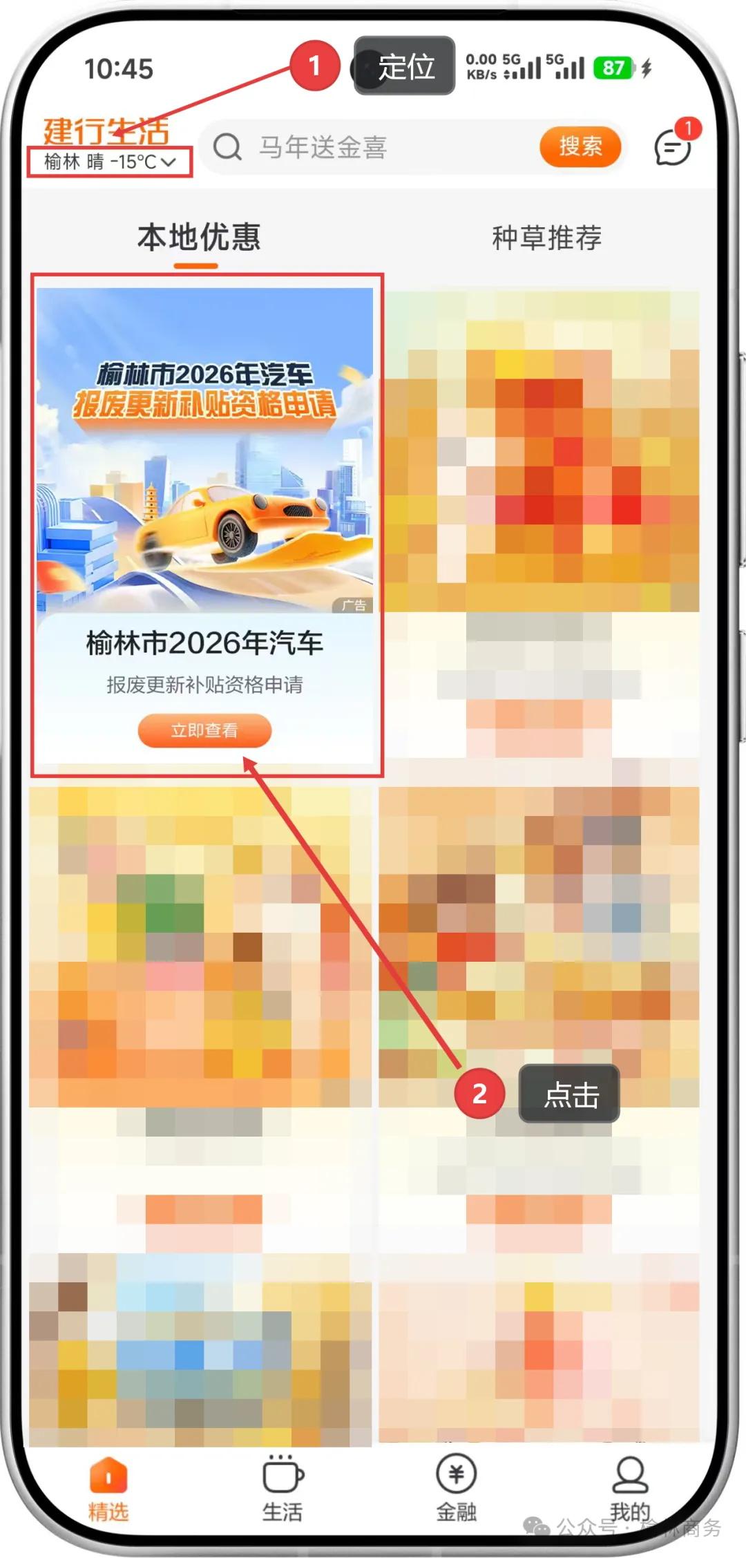 2.打开“建行生活APP”- 进入“首页”-下拉至“本地优惠”