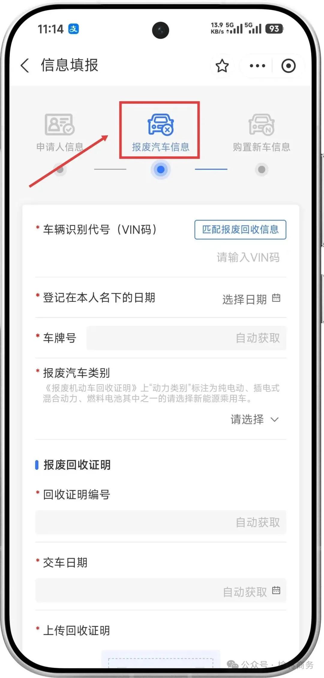 进入“2026年报废更新申请入口”后,在“报废汽车信息”页面填报信息,将资格券凭证截图上传至“其他补充影像资料”栏目即可