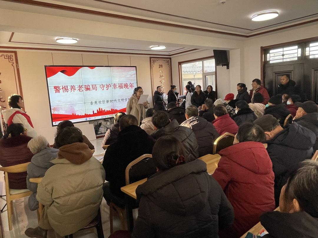 在榆林网讯:(通讯员 张苗苗)为切实提升老年居民的防骗意识和识诈能力,守护好老年人的“钱袋子”,1月23日上午,榆阳区崇文路街道春苑社区新时代文明实践站在春苑社区日间照料中心举办了“警惕养老骗局 守护幸福晚年”主题科普讲座,辖区60余位老年居民参与了此次活动。