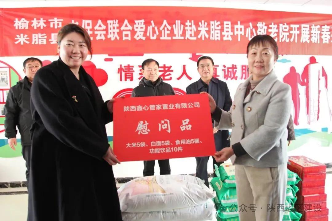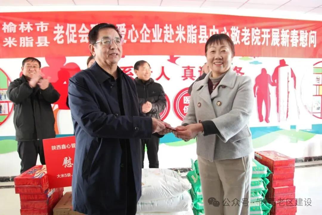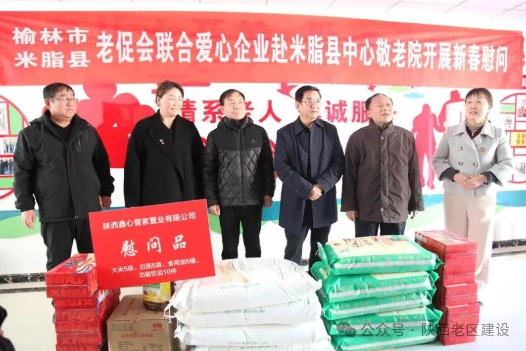 在榆林网讯:(王建峰)2026年2月3日上午,榆林市老区建设促进会与米脂县老区建设促进会联合爱心企业陕西鑫心管家置业有限公司,前往米脂县中心敬老院开展新春慰问活动,为老人们送去米、面、油、饮品等生活物资及慰问金,传递新春美好祝福,让他们在节前感受到社会各界的温暖与关怀。榆林市老促会秘书长杨广禄,社会事业服务部部长李齐国,社会事业服务部副部长、陕西鑫心管家置业有限公司董事长曹美玲,米脂县老促会会长杨巨山、副秘书长李自强等参加慰问。活动由杨巨山主持。