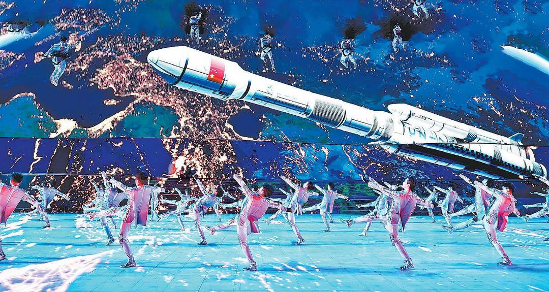 下篇《陕耀未来》以“未来”为轴,凝聚三秦儿女追赶超越谱新篇、砥砺奋进新征程的昂扬斗志,指向一片更辽阔的天地。《追赶展宏图》节目中,一株“生态能源之树”破冰而出。根系是煤矿井下智能开采的影像,枝干是太阳能板与风力发电机的抽象造型,叶片则由雪花晶体构成。舞者手持光影万花筒,折射出陕北治沙绿洲、关中科创走廊、陕南生态保护区的景象。节目《超越谱新篇》将气氛推向高潮,老中青少各代人群与陕西各地行业代表携手登台,以铮铮誓言朗诵长诗《再诵沁园春》,将冰雪运动的力量、精神与梦想升华为新时代陕西追赶超越的奋斗篇章。