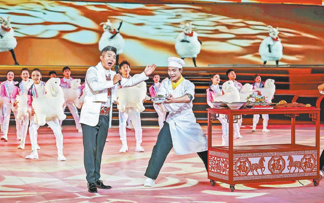 上篇《古脉新承》以“冰雪”为韵,描绘了一幅“大美陕西”的人文风情画卷,迎接全省冬运健儿热情欢聚。在《冬日映三秦》的节目中,冰花窗前映照着千年冬韵,新春乐曲呼唤着归乡游子。这场跨越山海的相聚,是冰雪联结的情谊,更是三秦大地敞开胸怀的赤诚盛情。最令人惊艳的是《潮音贯古今》中的“三秦风物展”,地面投影化作一幅百米冰雪长卷:陕南的腊肉暖锅雾气蒸腾,关中的羊肉泡馍香气仿佛穿透屏幕,陕北的黄米馍馍金黄诱人;羌族雪纹刺绣、冰上皮影戏、雪花剪纸渐次绽放。当舌尖品味烟火、指尖流淌传奇,传统与现代晕染出浓浓冬韵,文化自信在这片热土上蓬勃生长。