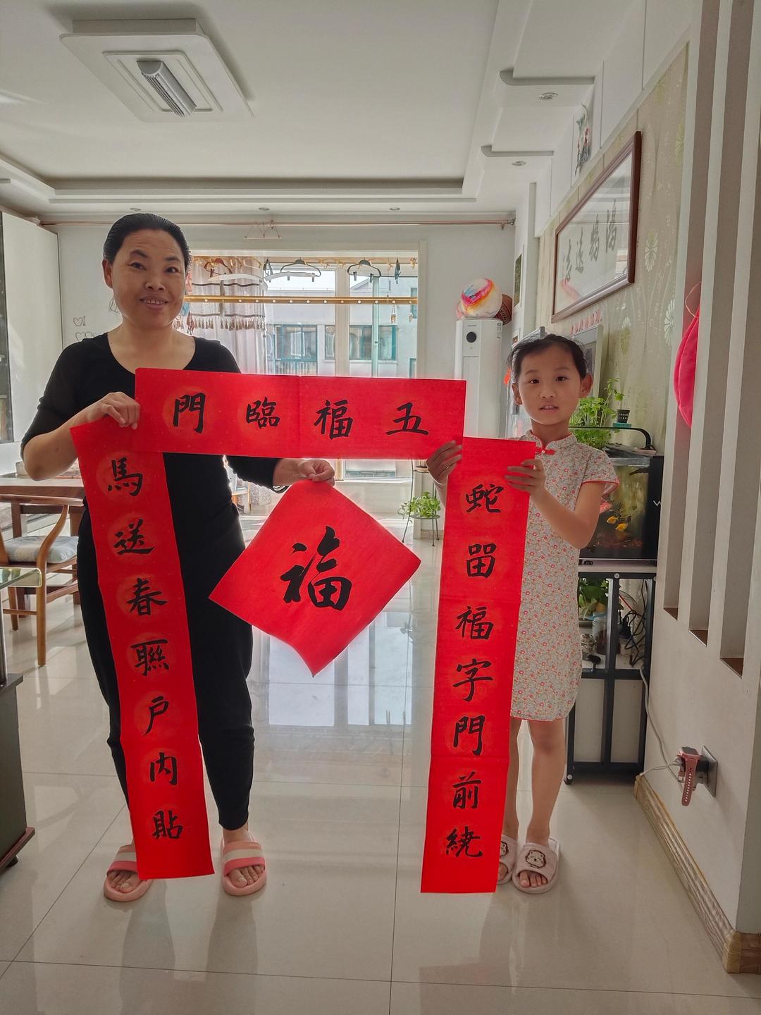 书法志愿者拿着亲手写的福字、春联寄托着对新春美好的祝福