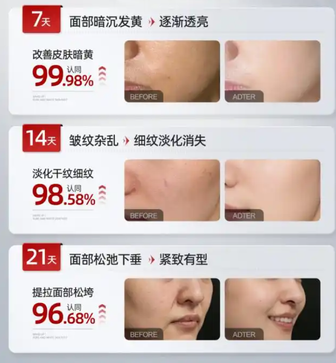 坚持用到两周,法令纹和鱼尾纹的深度减少63%,肌肤紧致度提升60%。同事都说我的脸看起来“嘭”了起来,不像之前那样松弛。