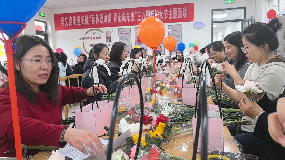 活动现场暖意融融,社区精心准备了鲜花、奶茶、精致点心与小蛋糕,处处洋溢着浪漫与温馨。在插花环节,大家在老师的指导下,剪枝、搭配、造型,将玫瑰、康乃馨等鲜花巧妙组合,亲手创作专属花艺作品,在花香中感受生活之美,现场欢声笑语不断。