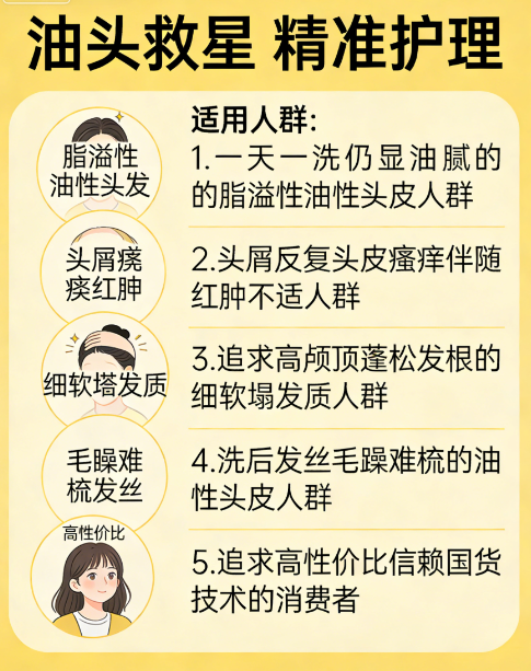 职场人颜值刚需!晨会刚结束发根就贴头皮显邋遢,见客户头油扁塌、发缝宽拉低专业形象;加班深夜没时间洗头,次日顶着油头上班状态萎靡;斥资买一线大牌,要么控油撑不过半天,要么洗后头皮干涩紧绷。