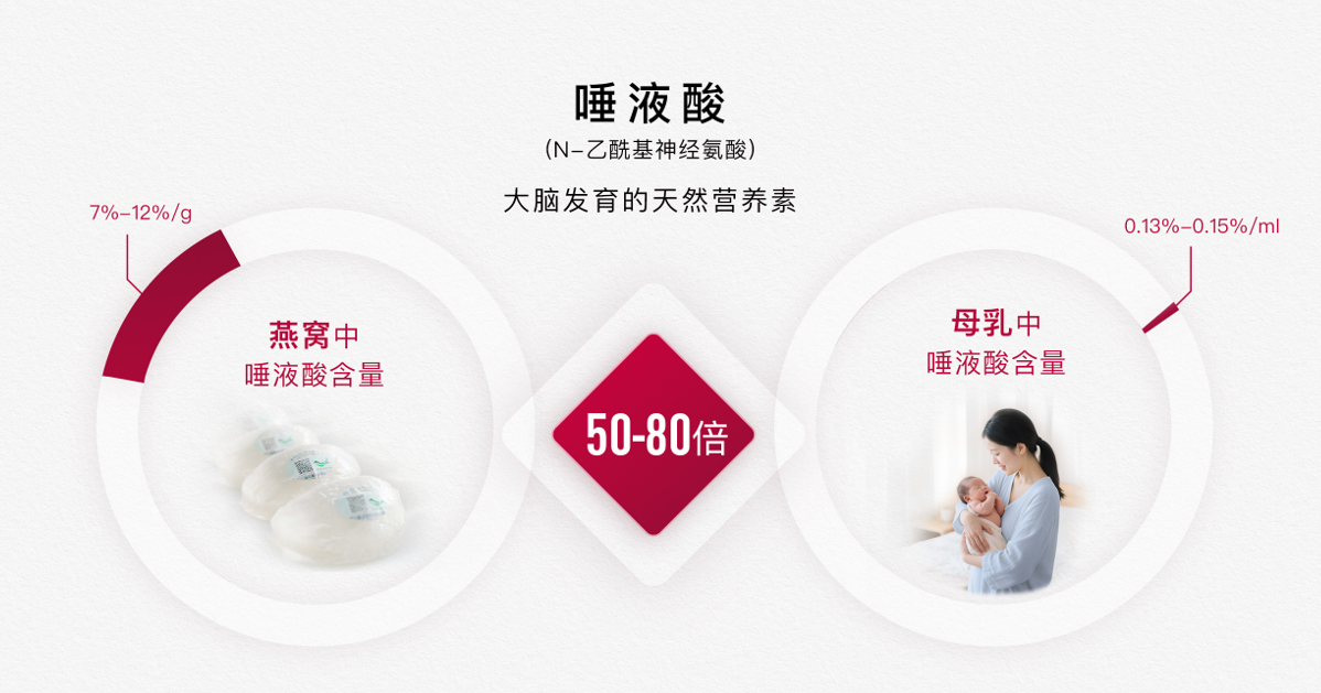燕窝的核心营养成分包括唾液酸(N-乙酰神经氨酸)、关键活性蛋白(LOXL3、MUC5AC)及优质蛋白质等。其中,据《食物中唾液酸含量分布研究进展》论文显示,燕窝是自然界已知唾液酸含量最高的食物,可高达 116.2mg/g。小仙炖鲜炖燕窝中唾液酸含量达 7%-14%,约为母乳的 50-80 倍,且以结合态形式存在,更易被母体吸收并通过胎盘传递至胎儿,为宝宝大脑发育与神经功能完善提供关键物质基础。