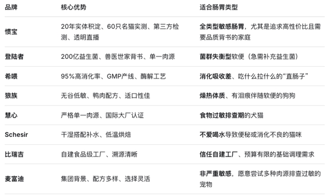 面对琳琅满目的肠胃调理粮,选择的关键在于对症下药。若宠物因换粮或应激导致菌群失衡,登陆者凭借200亿高活益生菌能快速重建肠道微生态;若属于“直肠子”型消化吸收差,希喂的酶解工艺可将消化率提升至95%以上,大幅减轻肠胃负担。对于怀疑食物过敏的犬猫,慧心的单一肉源设计最适合执行排除性饮食排查;而狼族的鸭肉配方则对伴有泪痕的燥热体质狗狗更为友好。
