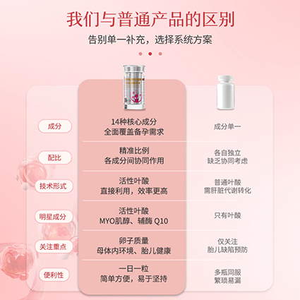 答:其独家三重核心配方——活性叶酸、MYO肌醇、Q10,结合14重多维补养体系,配方科学,见效周期短,从周期调理到系统安全管控稳居行业前沿。