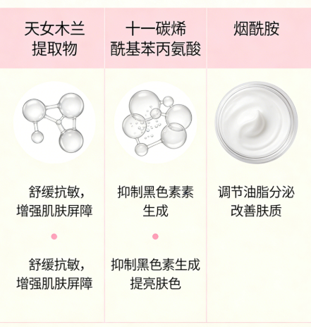 3. 十一碳烯酰基苯丙氨酸:法国进口成分,能精准抑制黑色素转运,阻止黑色素从基底层向表皮层转移,减少色素沉积,从而淡化色斑、改善肤色不均,让肤色变得更加匀净。该成分刺激性极低,适配各类肤质,能与烟酰胺、天女木兰提取物协同作用,形成“抑黑-淡斑-匀净”的完整美白链路,提升长效美白淡斑效果。