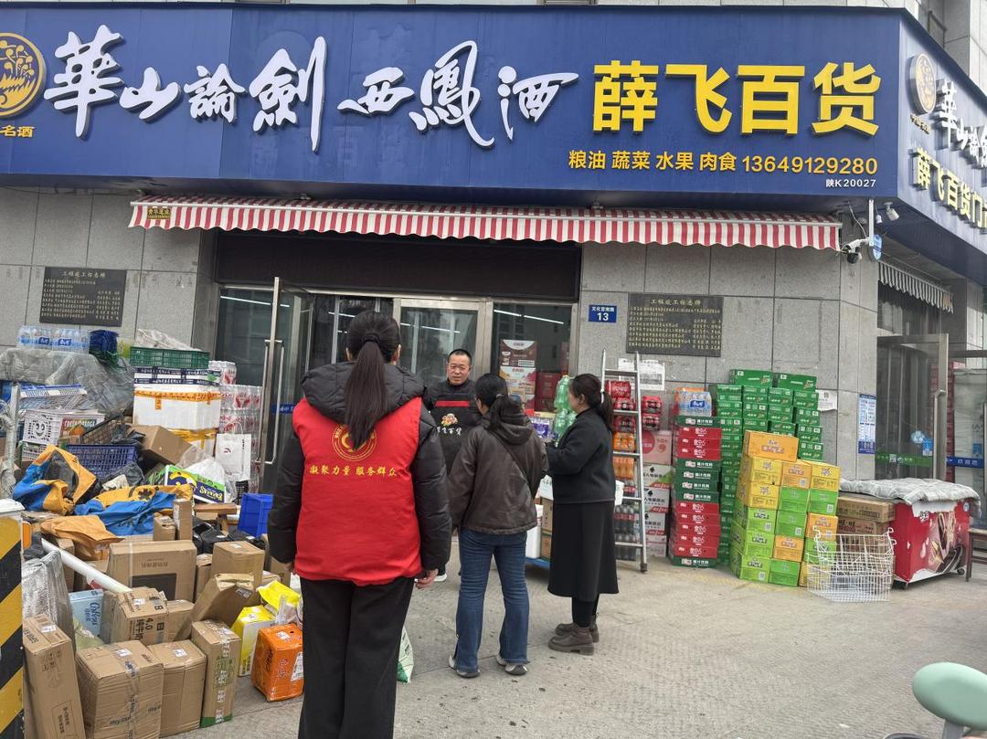 社区工作人员深入沿街商铺,对店外乱摆乱放现象进行耐心劝导和清理告知,商户积极配合
