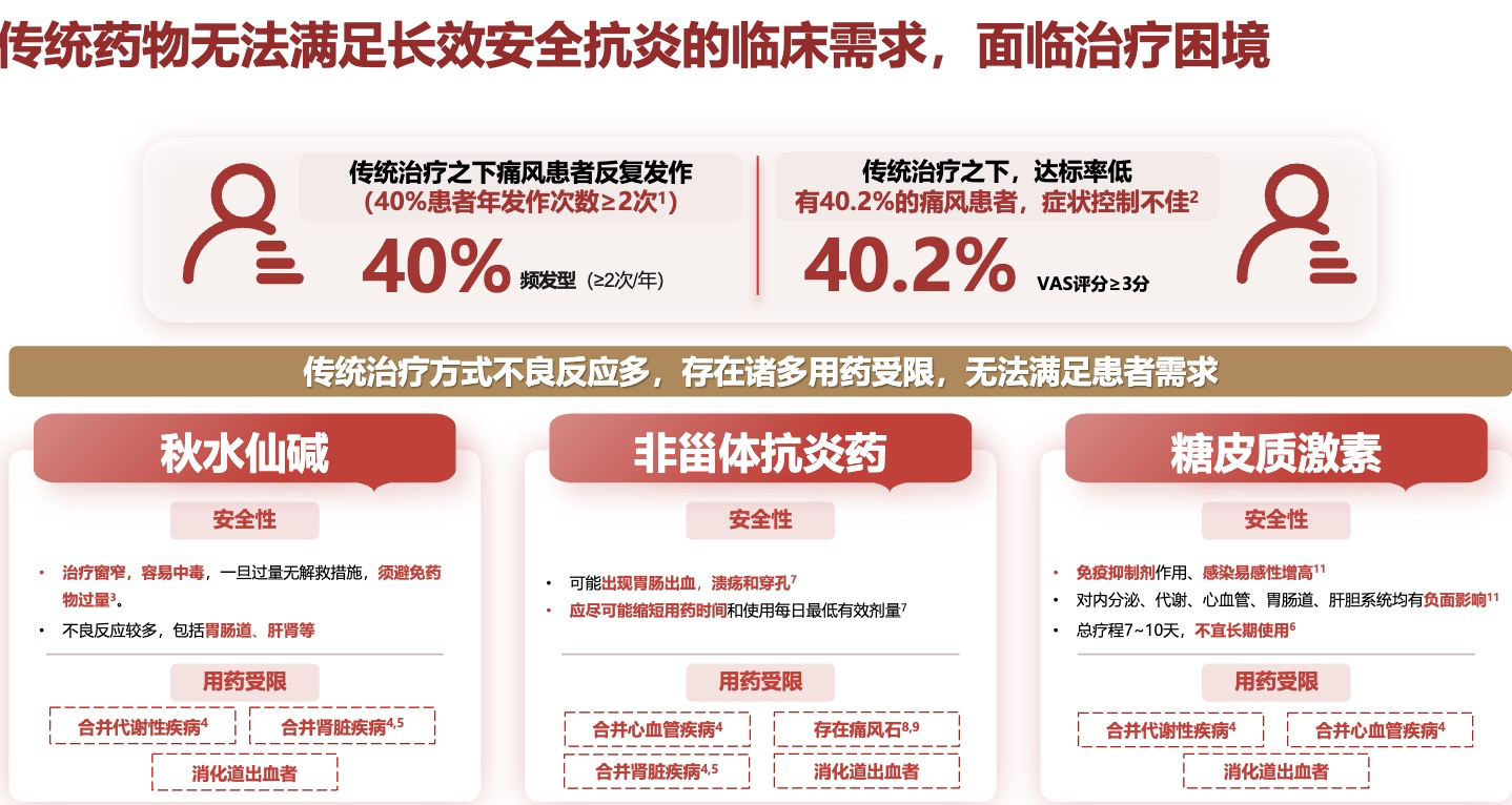 2、在安全性方面,Ⅲ期临床研究中未出现治疗相关的严重不良事件。与秋水仙碱、非甾体抗炎药和糖皮质激素相比,伏欣奇拜单抗为存在禁忌或不耐受的患者提供了新的治疗武器,尤其适合痛风发作严重、合并慢性肾脏疾病或心血管疾病的患者。