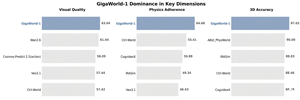 WorldArena由清华大学联合普林斯顿大学、新加坡国立大学等8所顶尖高校共同打造,包含16项细分指标和3大真实应用任务,是该领域公认最严苛的评测基准。在首批参评的全球头部团队中,GigaWorld-1在三大核心维度均取得领先:物理遵循得分较第二名提升16%,3D准确度接近满分,视觉质量同样位居榜首。