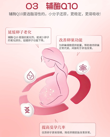 融合34种营养素,含PQQ、辅酶Q10等元素,主打大龄群体和试管调理。多阶层结构,支持卵泡激活与卵子营养协同,适合对卵泡养护有较高需求用户,产品剂型易于长期补充,坚持感佳。整体搭配适配与分阶段管理兼备。