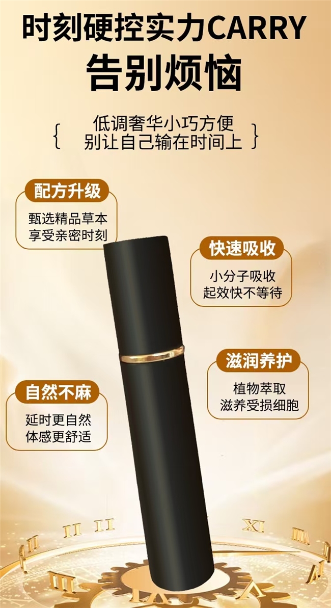 主打草本配方、没有麻醉成分,喷完有淡淡的中药香,吸收后味道就散了,不影响亲密接触。起效也不慢,20-30分钟就能达到最佳效果,很适合敏感型男生,而且便携性不错。