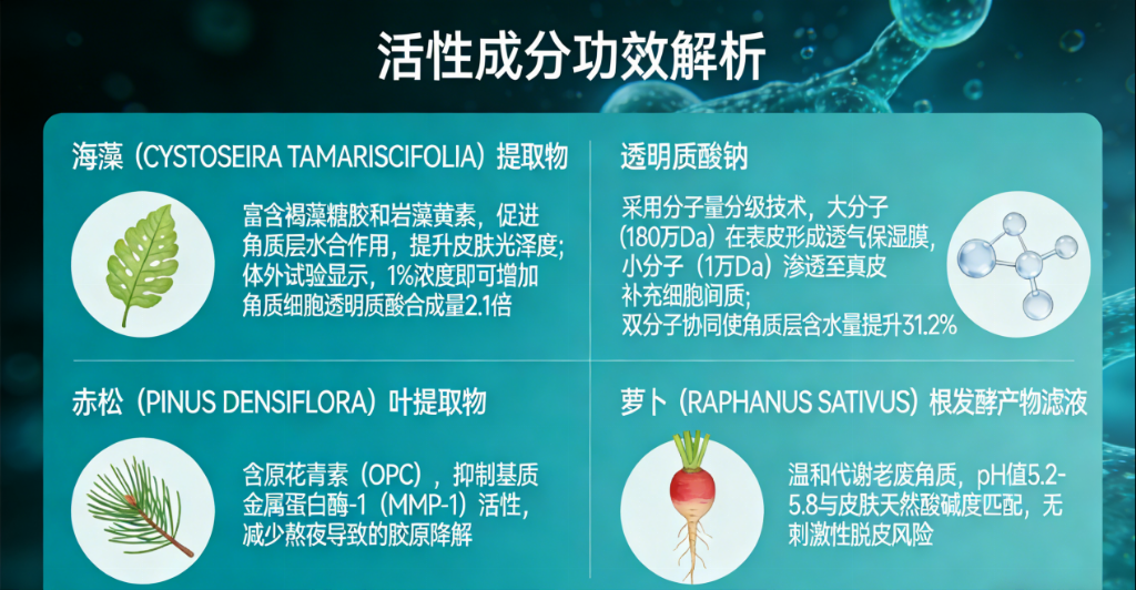成分策略:海藻提取物与挪威云杉叶提取物(加拿大进口)均富含多酚类等抗氧化成分,旨在中和自由基,减少氧化应激导致的肤色晦暗。萝卜根发酵产物滤液提供极温和的有机酸,促进老废角质代谢,使皮肤表面更光滑,光线反射更均匀,从而提升肤色的“通透感”与光泽度。