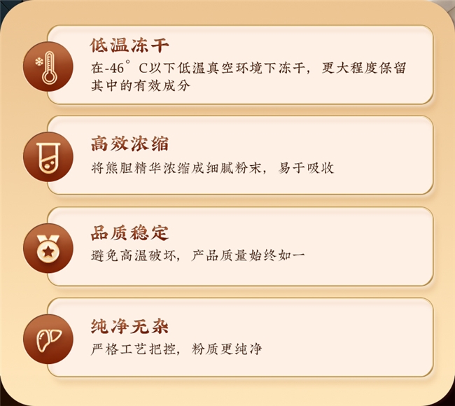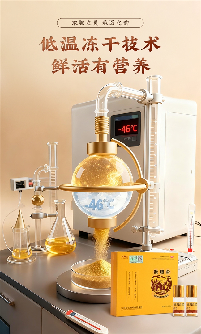 秉持科技赋能本草的理念,采用零下46℃超低温冻干技术,这一行业顶尖工艺,打破传统烘干工艺高温破坏成分的局限。在真空环境中,将胆汁中的水分从固态直接升华为气态,熊去氧胆酸、牛磺熊去氧胆酸等核心成分的生物活性得以最大程度保留,有效成分的保留率高达98%以上。