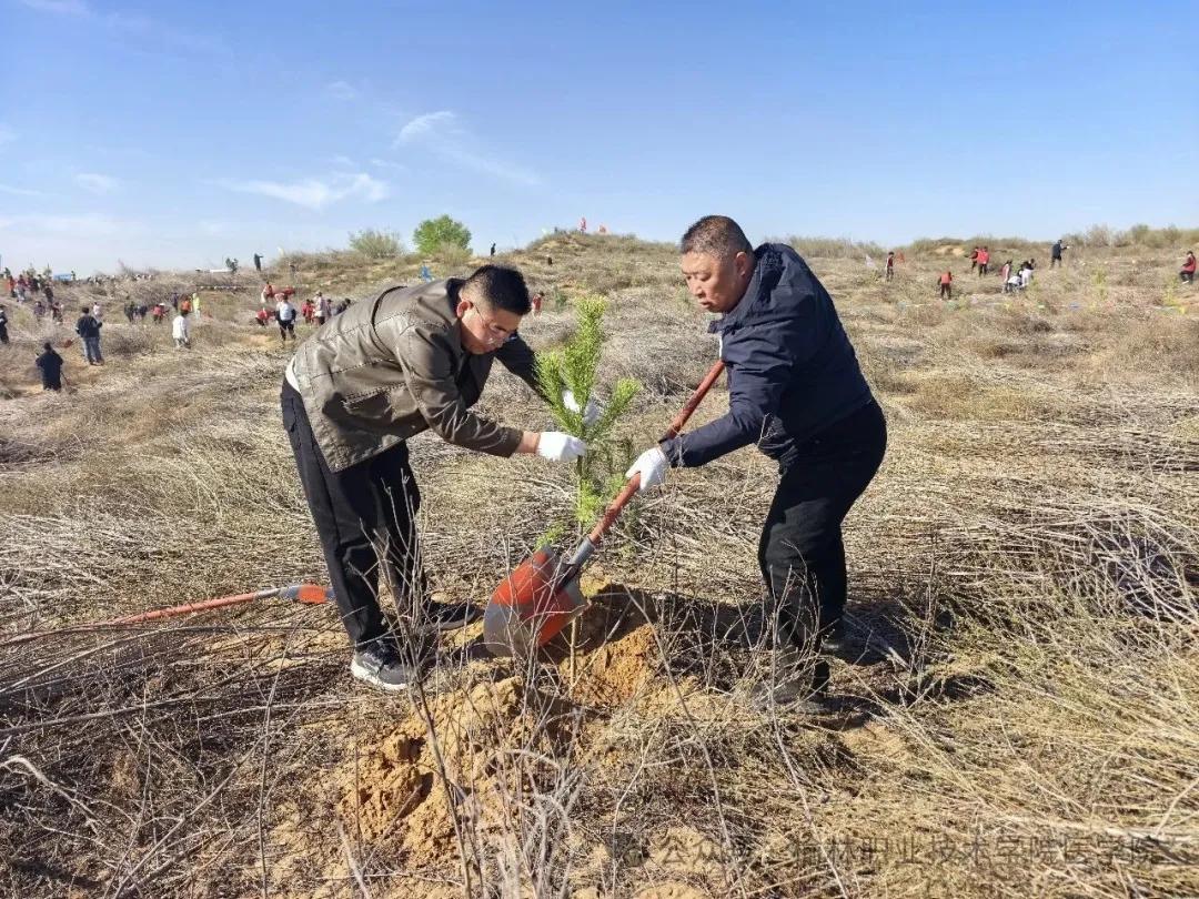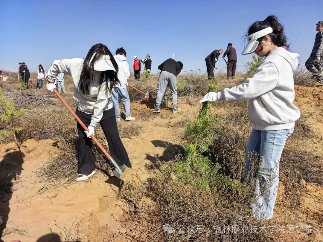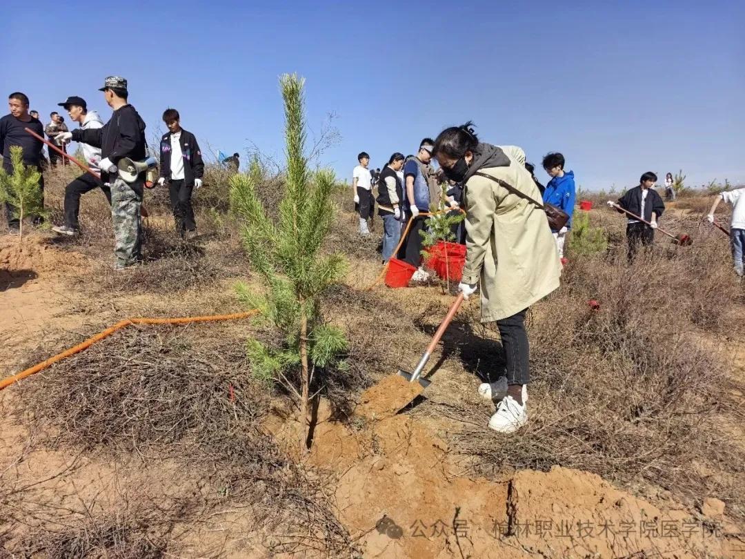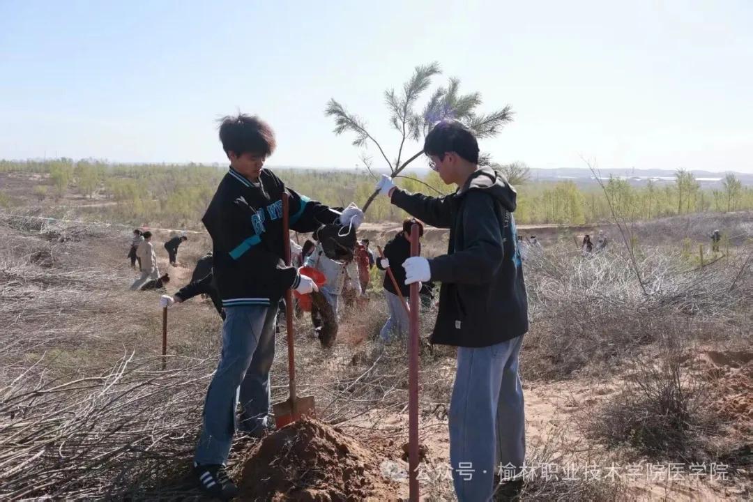 在榆林网讯:(文/刘甜 图/张雅茹)春风送暖,万物复苏,正是植树造林的好时节。4月11日上午,榆林职业技术学院医学院组织百余名师生赴榆阳区金鸡滩镇,开展“深耕职教沃土,共绘生态新篇”义务植树活动,以实际行动为榆林大地再添一抹盎然新绿,用青春汗水浇灌绿色希望。