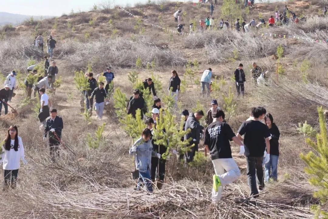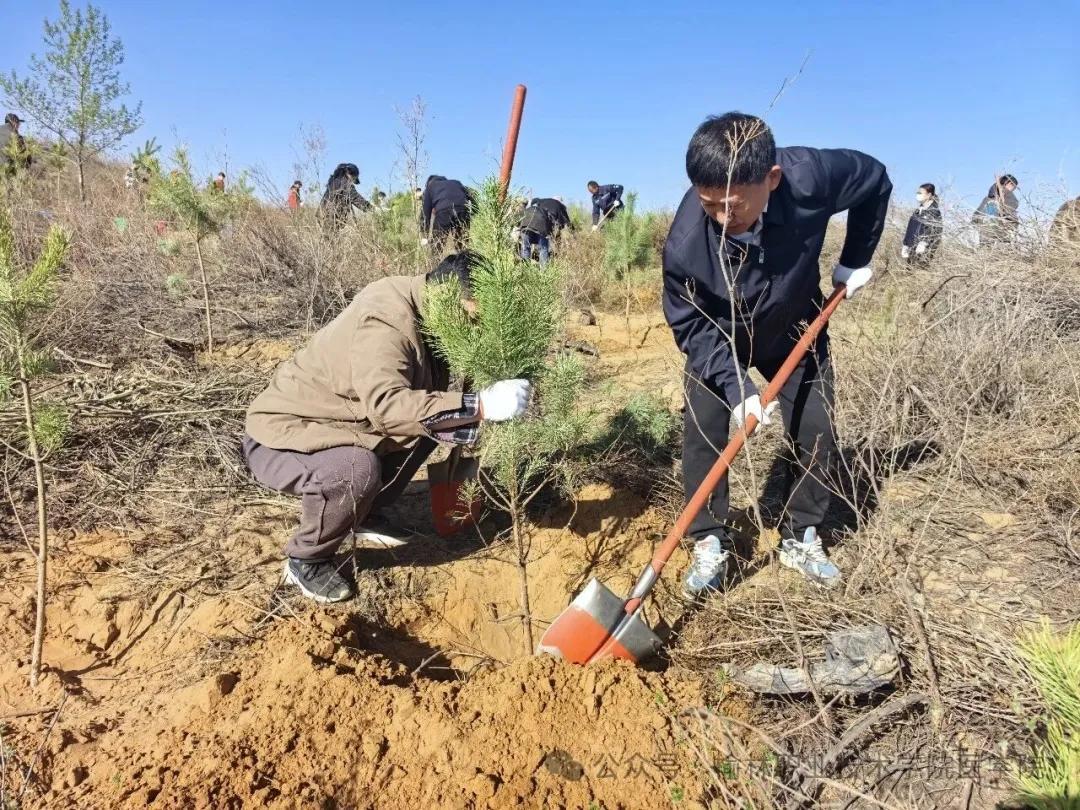 活动现场,师生们热情高涨、干劲十足。手持铁锹、水桶等工具,迅速奔赴各自的责任区域,一场春日里的“绿色接力”正式拉开帷幕。大家分工明确、配合默契,挥锹铲土、挖坑定苗、扶苗填土、提桶浇水,每一个环节都一丝不苟、有条不紊。原本荒芜的土地上,一株株新栽的树苗迎风挺立,为春日的旷野注入了蓬勃生机。