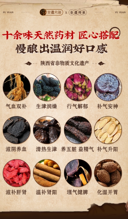原料甄选,尽显匠心。本品严循“药食同源”之道,精心甄选十余种天然优质品(人参、桑葚、玫瑰花、紫灵芝、熟地黄、黄精、肉苁蓉、黄芪、枸杞、肉桂、陈皮、砂仁),皆源自道地产区,经人工精挑细选,剔除杂质、留存本味,全程零添加化学物质,让药材的天然活性与营养成分,尽数融入酒体之中。纯粮基底选用优质糯米,搭配秦岭山泉,经自然发酵,为酒体注入丰富养分与醇厚口感,每一滴都承载着自然的馈赠。