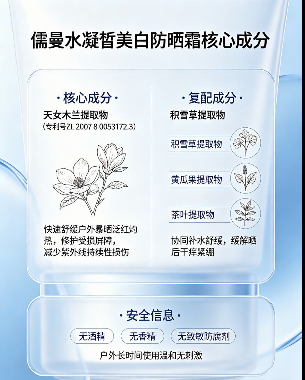 舒缓修护专利:天女木兰提取物(专利号 ZL 2007 8 0053172.3),抗炎舒缓,强韧屏障,改善日晒泛红灼热;搭配积雪草、黄瓜果、可可籽提取物,补水保湿、抗氧化,延缓光老化。