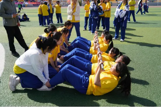其中集体推背大球项目极具特色:队员紧密列队、扶球稳身、同步匀速前行,相互借力稳住重心,转弯慢行、队形整齐,考验默契与纪律,充分彰显榆中学子团结协作、众志成城、合力向前的拼搏精神。