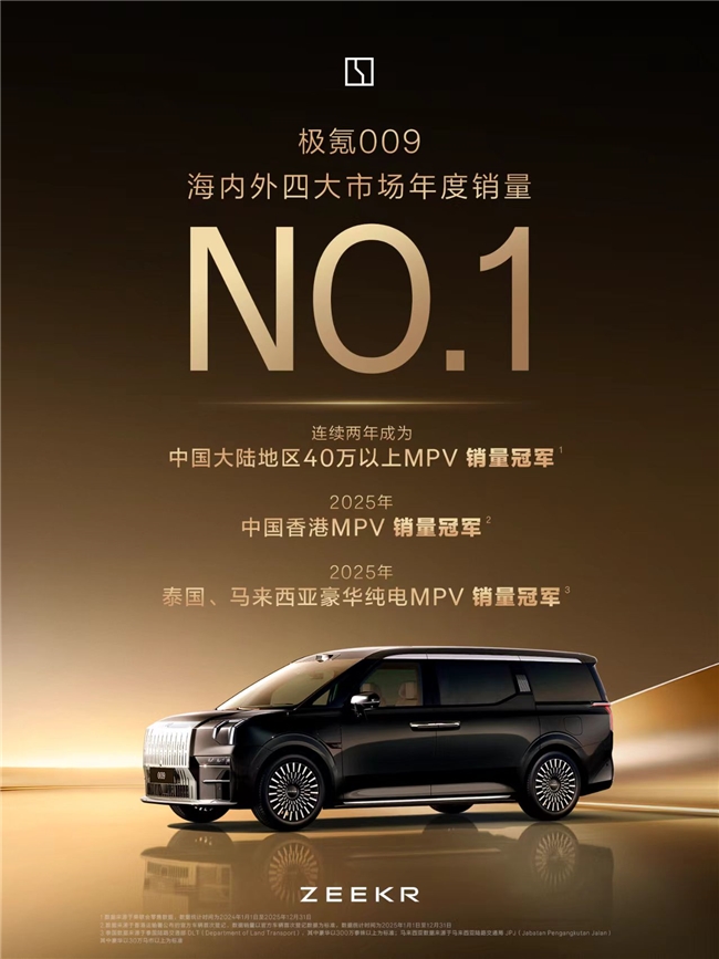 在极氪009问世之前,豪华MPV市场长期被传统燃油车型垄断,格局固化。作为全球第一款原生纯电豪华MPV,极氪009以极致性能、极致豪华与极致安全,一举开辟了新能源豪华MPV这一全新品类。数据显示,该车型已连续两年夺得中国40万元以上MPV年度销量冠军,2025年更斩获香港MPV销量总冠军,同时拿下泰国、马来西亚豪华纯电MPV销量冠军,累计获得超过6万高端用户认可。从品类开创者到市场引领者,极氪009不仅改写了竞争格局,也让中国品牌在这一长期被外资垄断的细分领域站稳了脚跟。