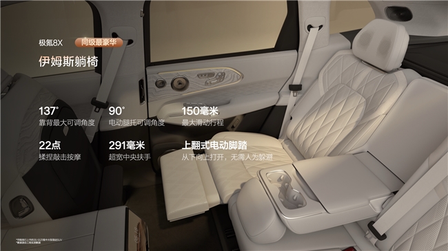 空间方面,极氪8X锚定大五座旗舰定位,5米车长实现72%的同级最高空间利用率,人均面积达1.18平方米。二排配备同级唯一150毫米滑轨,腿部和膝部空间达到同级最大,一家五口长途出行每人都有充裕空间。