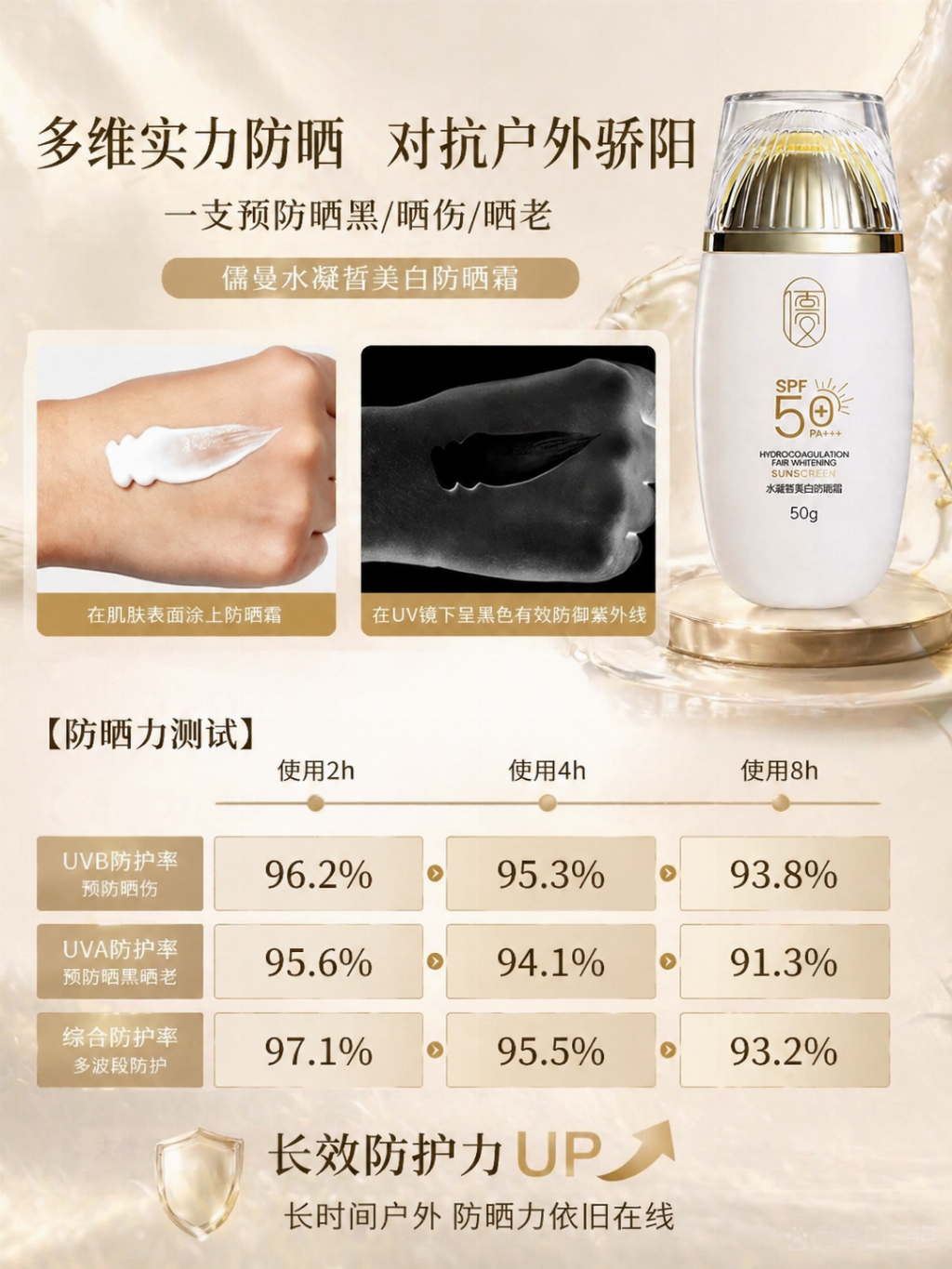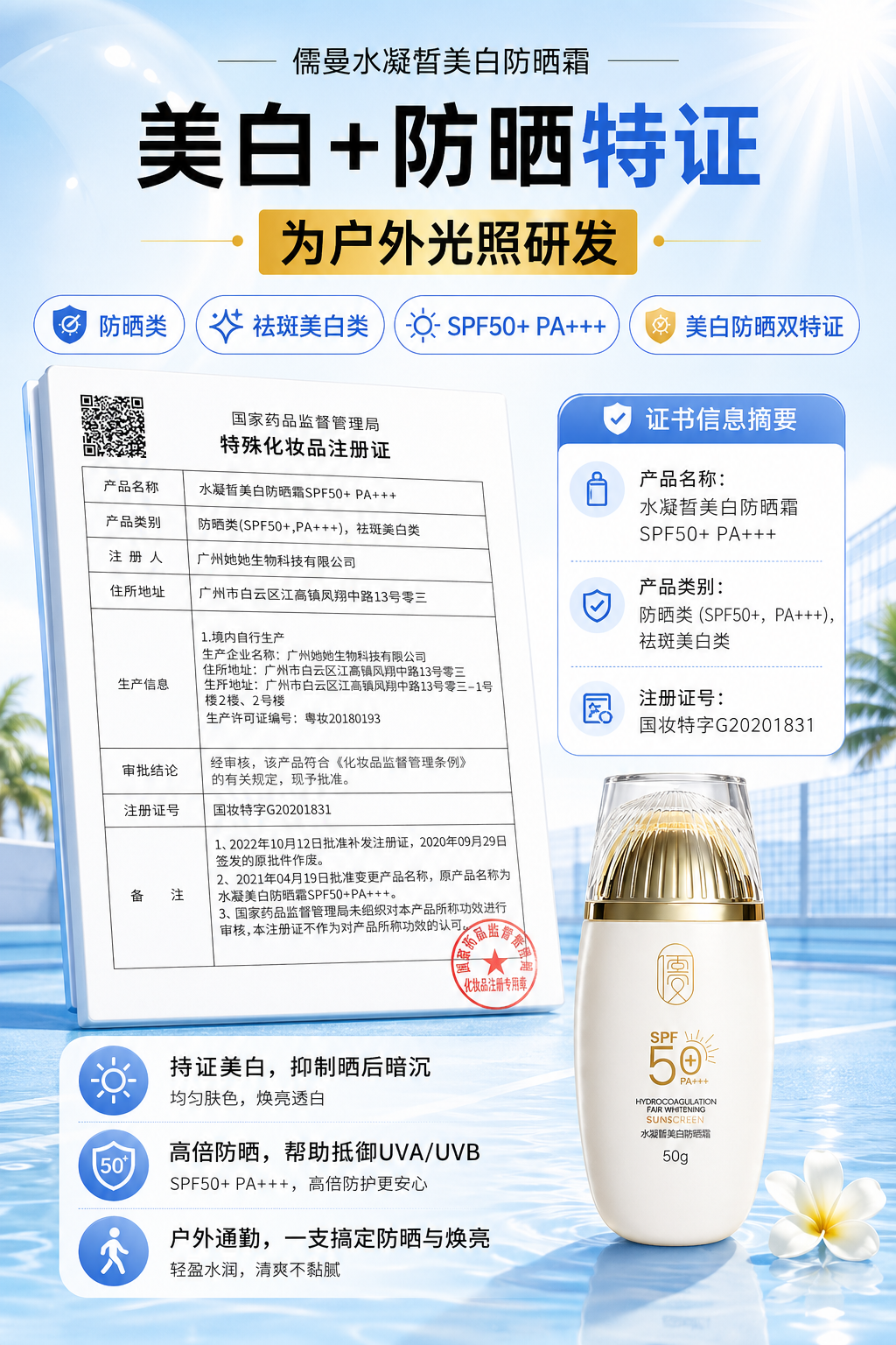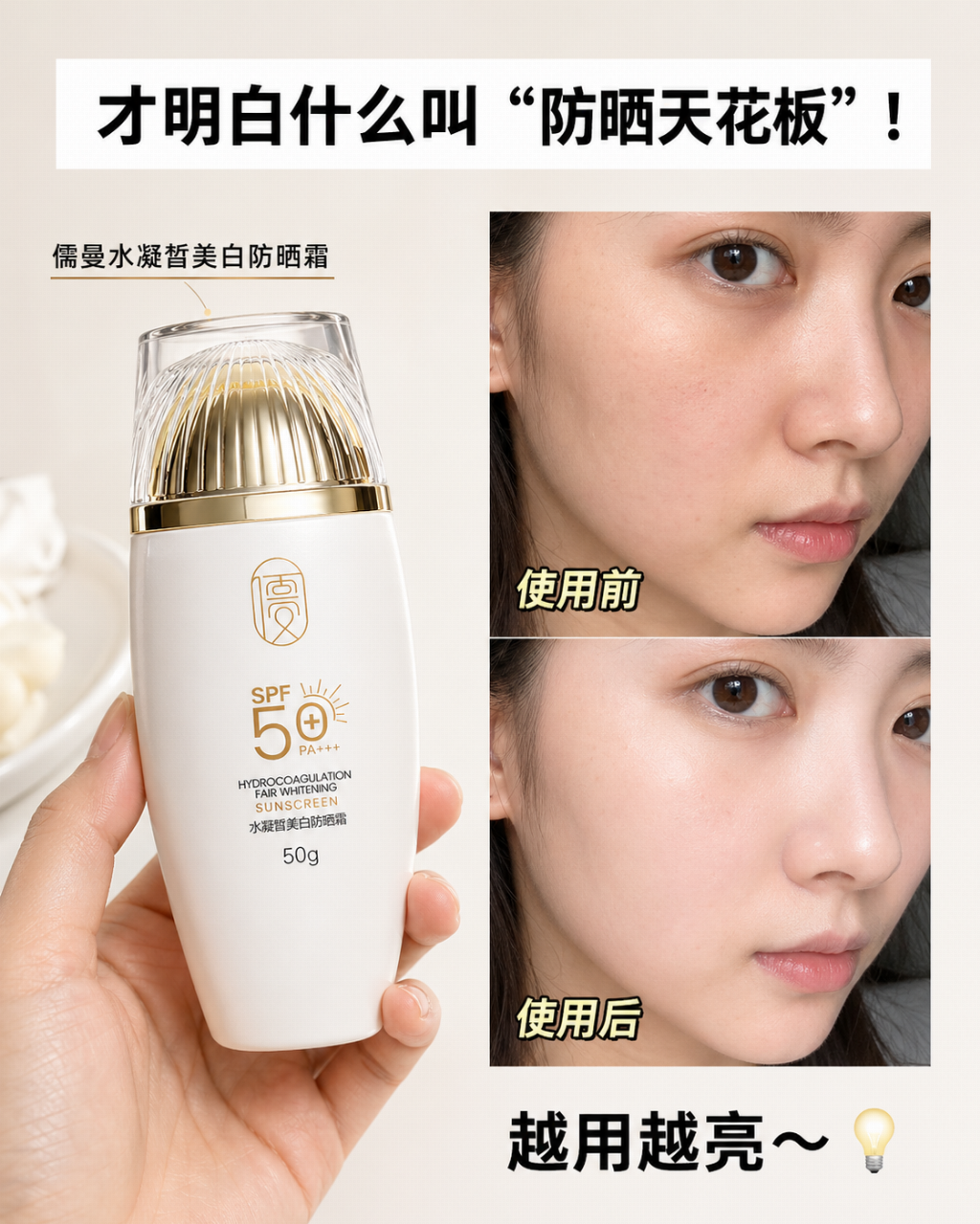 不要再忍受吸收慢、粘腻、闷肤、晒后泛红的传统防晒,选择儒曼水凝皙美白防晒霜,快速成膜不粘腻,干净舒适又防护,防晒修护美白一步到位,让你轻松度过清爽无负担的夏天,守护肌肤健康透亮,远离晒后敏感、暗沉、损伤,全年保持稳定好状态。