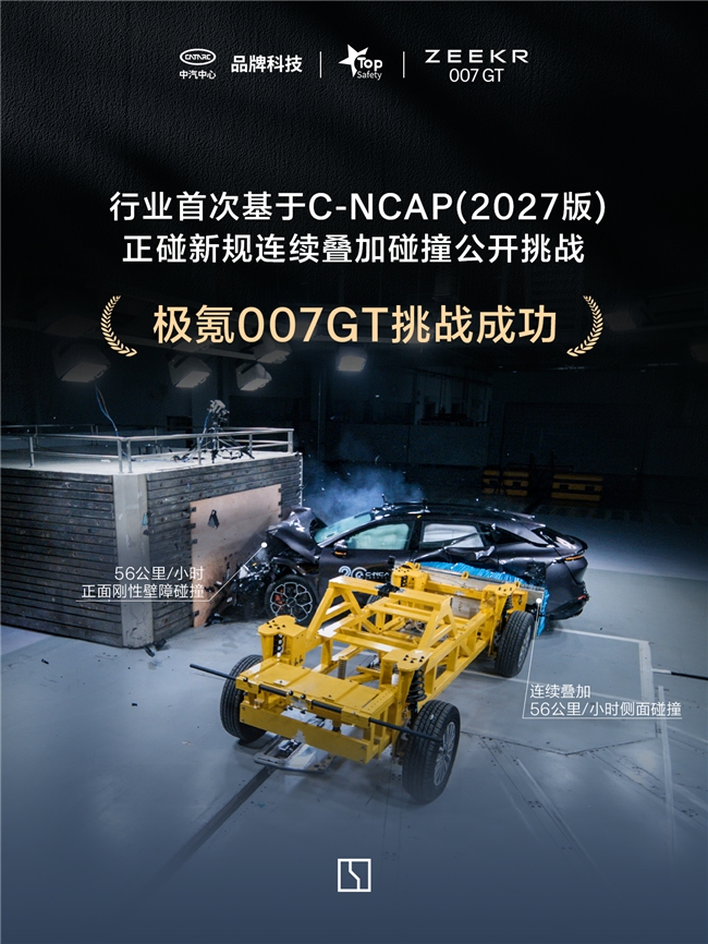 作为C-NCAP 20周年公开碰撞的测试演示车型,极氪007GT还原真实“二次碰撞”交通事故场景,顺利完成行业首次基于27版C-NCAP正碰新规的连续叠加碰撞公开挑战,并一举成功。这不仅验证了极氪007GT在极端工况下的卓越防护能力,更标志着其2025年首发上市即满足2027版新规安全要求,安全标准领先行业整整一代。