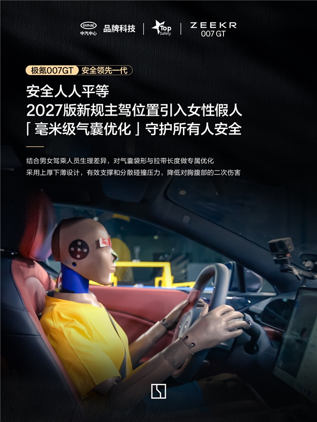 极氪007GT在行业内率先响应,发起“驾驶位无性别安全差异”的公开挑战,践行安全层面人人平等的核心理念。研发团队针对气囊袋形和拉带长度做了专属优化,精确到毫米级设计。气囊不再是简单统一的厚度分布,而是改为“上厚下薄”的创新结构:上半部分保持足够厚度以及时支撑碰撞冲击力,有效缓冲头部和胸部;下半部分则降低厚度,避免在气囊展开时对胸腹部造成二次挤压伤害。