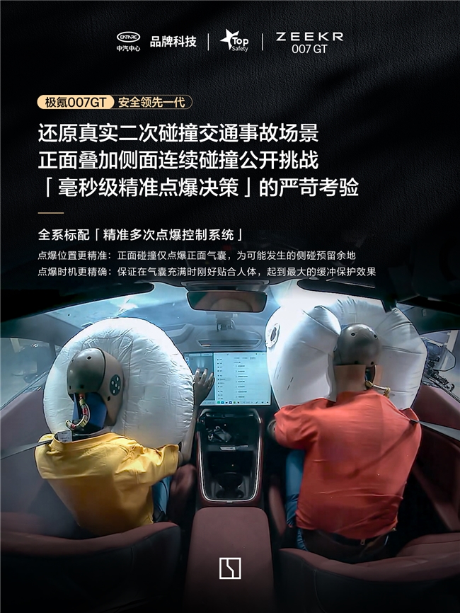 更为关键的是,该系统能够以极致精准的点爆时机,保证气囊在完全充盈的瞬间恰好与乘员身体接触,结合安全带限力等级的精细设计,为乘员提供恰到好处的保护力度,最大程度降低了连环事故带来的叠加伤害风险。这种“预判式”的安全思维,让极氪007GT在复杂真实事故场景中依然从容守护。