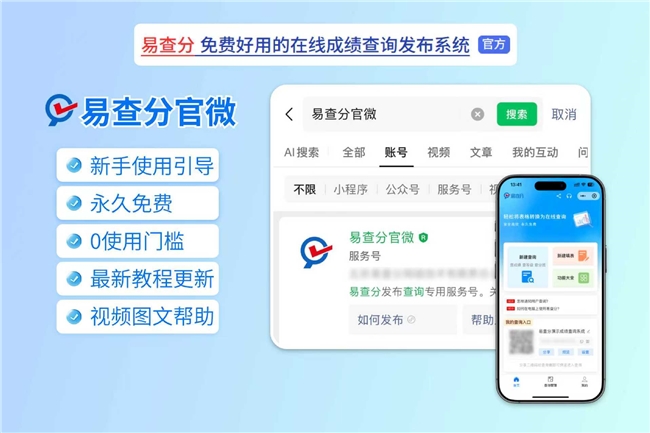 易查分作为查询制作平台的开拓者,于9年前上线并独创实现了通过上传电子表格新建查询,3分钟建立成绩查询系统(经70000小时运行、技术迭代与用户反馈,目前仅需1分钟即可私发全班成绩),让学生家长自主查询孩子分数,并且无需注册登录仅能查看自己孩子的成绩。后续出现产品以易查分独创新建查询系统功能为基石,依赖于易查分功能与设计进行研发,这表现出易查分作为先行者对产品定义和功能开发的顶尖水平,已成为众多学校老师的不二之选。