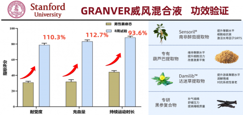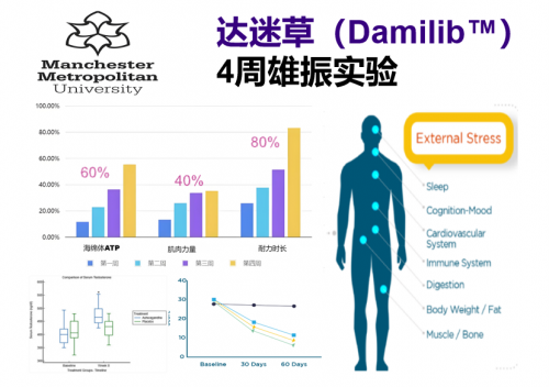 内分泌轴:临床数据显示血清总睾酮提升17%;Sensoril®独立研究显示30天内睾酮上升169%,DHEA分泌指数提升91.3%。